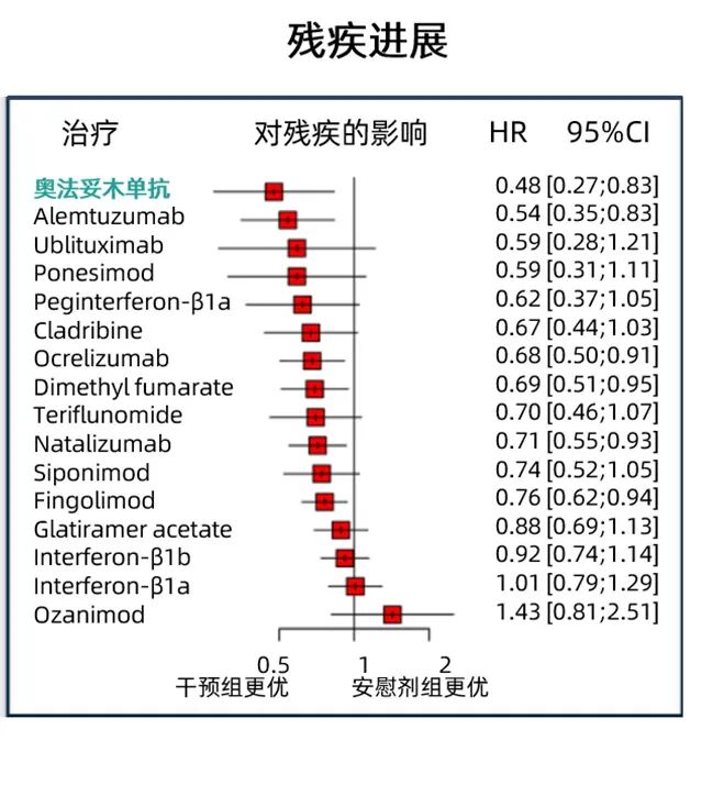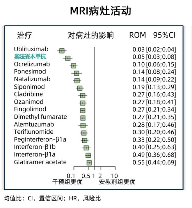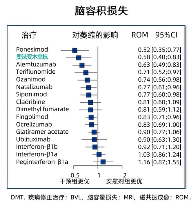 柳叶刀子刊发布的一篇关于DMT药物对于MS脑容量损失疗效的Meta分析,结果显示:与安慰剂相比,包含奥法妥木单抗在内的八种DMT药物可显著减少MS患者的脑容量损失(均值比ROM 0.58;95%CI 0.40-0.83),奥法妥木单抗对脑容量损失的治疗优势显著,且在预防MRI病灶活动及降低残疾累积中(HR 0.48)也显著获益6。