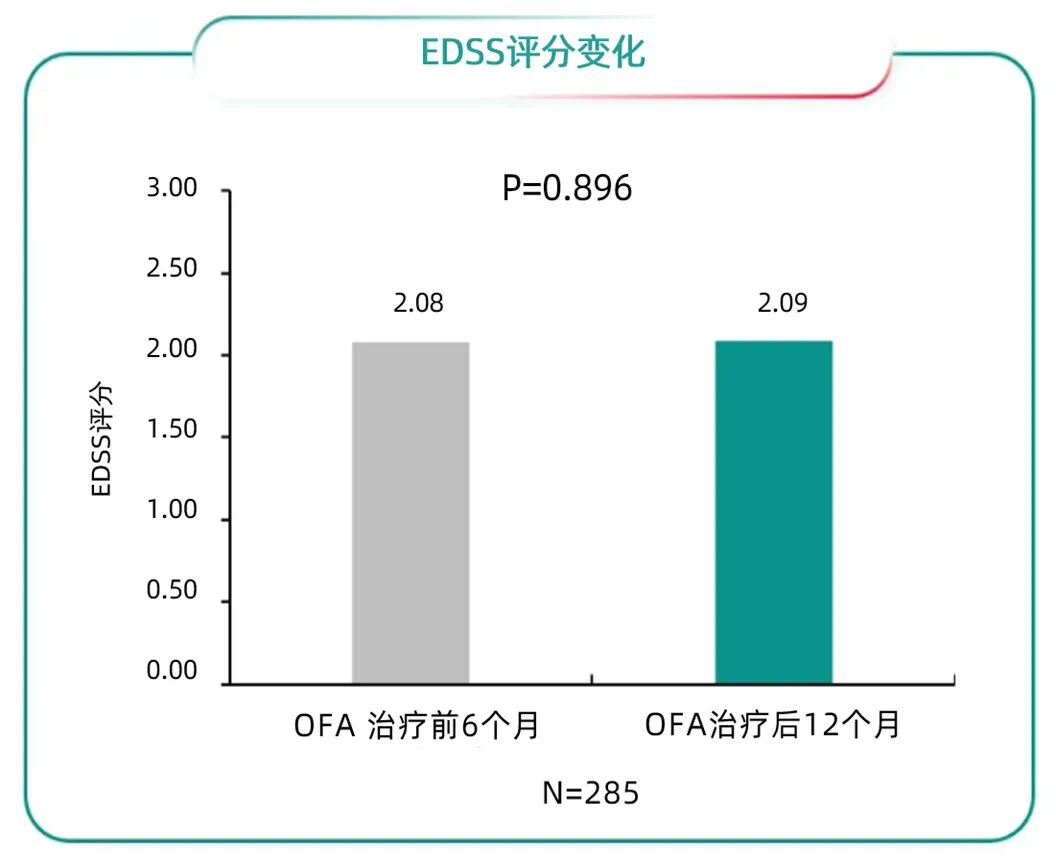 ➤ 延缓疾病进展:奥法妥木单抗治疗12个月,在具有可用MRI数据的患者中,无患者出现Gd+T1病变,大多数(88%)的患者在12个月时没有新发/扩大的T2病变(图3)。且在奥法妥木单抗治疗前6个月至治疗后12个月期间,EDSS评分保持稳定(治疗前均值2.08,SD 1.40;治疗后均值2.09,SD1.49)(图3)。