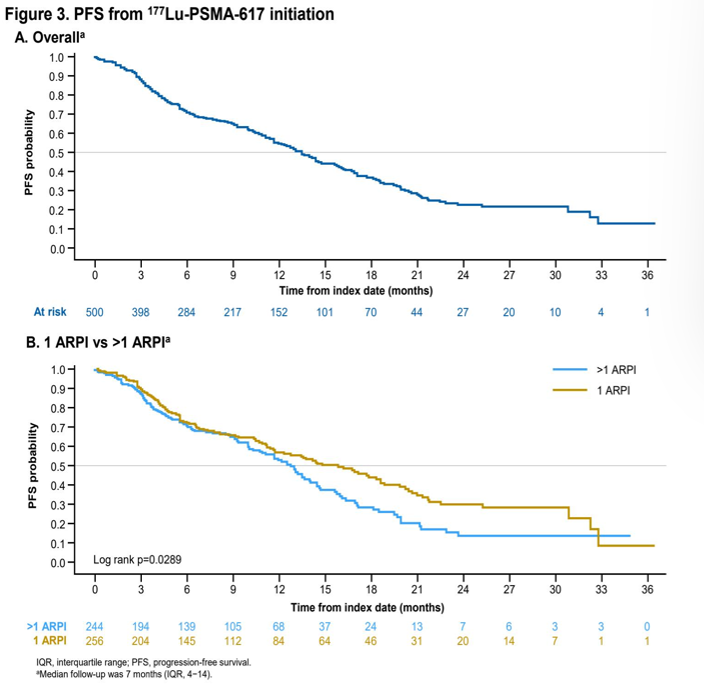 邢念增教授表示,PSMAfore研究为RLT在mCRPC早线阶段的应用提供了坚实的循证支撑。然而在真实临床场景中,患者异质性更强、病情更为复杂,使得真实世界研究成为验证临床证据、指导日常实践的关键环节。2026年ASCO-GU大会上,一项来自美国的真实世界队列(基于PRECISION 数据平台)[8]评估了177Lu-PSMA-617在化疗前mCRPC患者的真实世界疗效。该研究纳入500例既往接受≥1种ARPI且未经紫杉烷类化疗的mCRPC患者,结果显示,PSA50、PSA80和PSA90缓解率分别为63%、39%和26%;中位PFS为13.5个月(95%CI 11.7-14.7)。该研究与PSMAfore研究结果高度一致,进一步验证了177Lu-PSMA-617作为既往ARPI经治的PSMA阳性mCRPC患者优选方案的临床稳健性。研究还分析了既往治疗线数对疗效和生存的影响,与既往>1次ARPI治疗的患者相比,既往仅1次 ARPI治疗后立即启动177Lu-PSMA-617治疗的患者显示出更优的临床结局(中位PFS 15.8 vs. 12.7个月,p<0.05),这一发现为临床治疗顺序的选择提供了重要参考,提示早期应用177Lu-PSMA-617可能带来更大获益,支持其在ARPI经治后尽早使用。