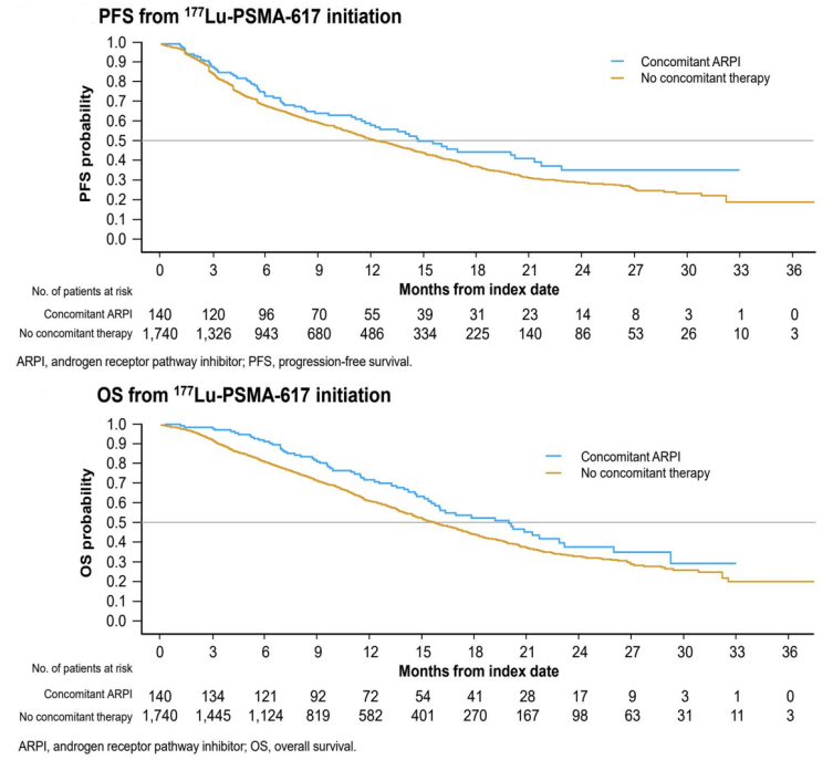 PRECISION数据平台还进一步探索了177Lu-PSMA-617在更多临床情境下的应用情况。研究[9]发现,在既往ARPI经治mCRPC患者中,与仅接受177Lu-PSMA-617治疗的患者相比,接受ARPI联合177Lu-PSMA-617治疗的患者的PFS(14.7个月 vs. 12.5个月,HR 0.84)和总生存期(OS,20.0个月 vs. 15.7个月,HR 0.70)获益更为显著。