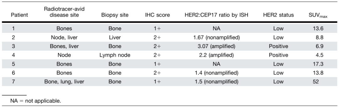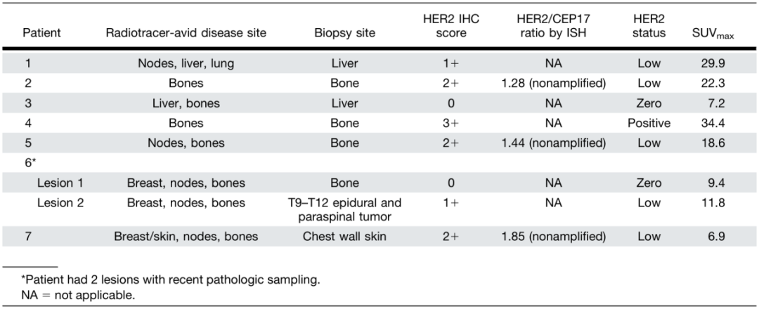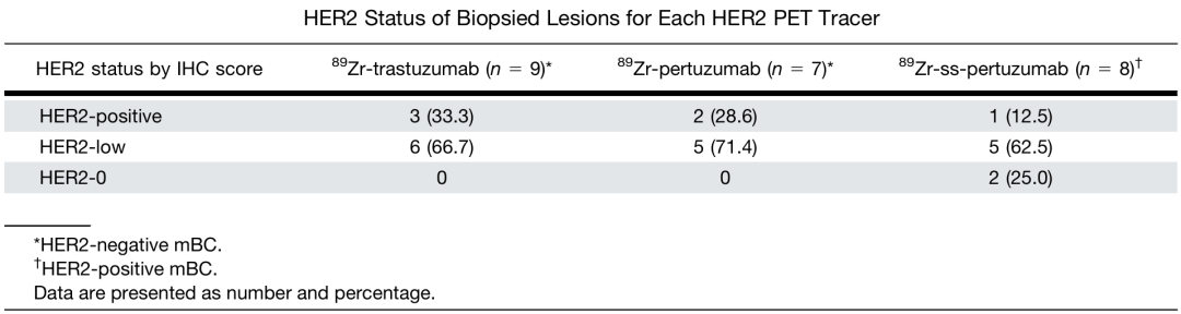 表1. 不同HER2 PET示踪剂活检病灶的HER2状态