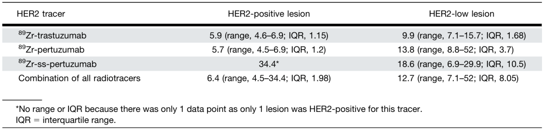 表5. HER2阳性和低表达病灶中不同放射性示踪剂队列及整体中位SUVmax