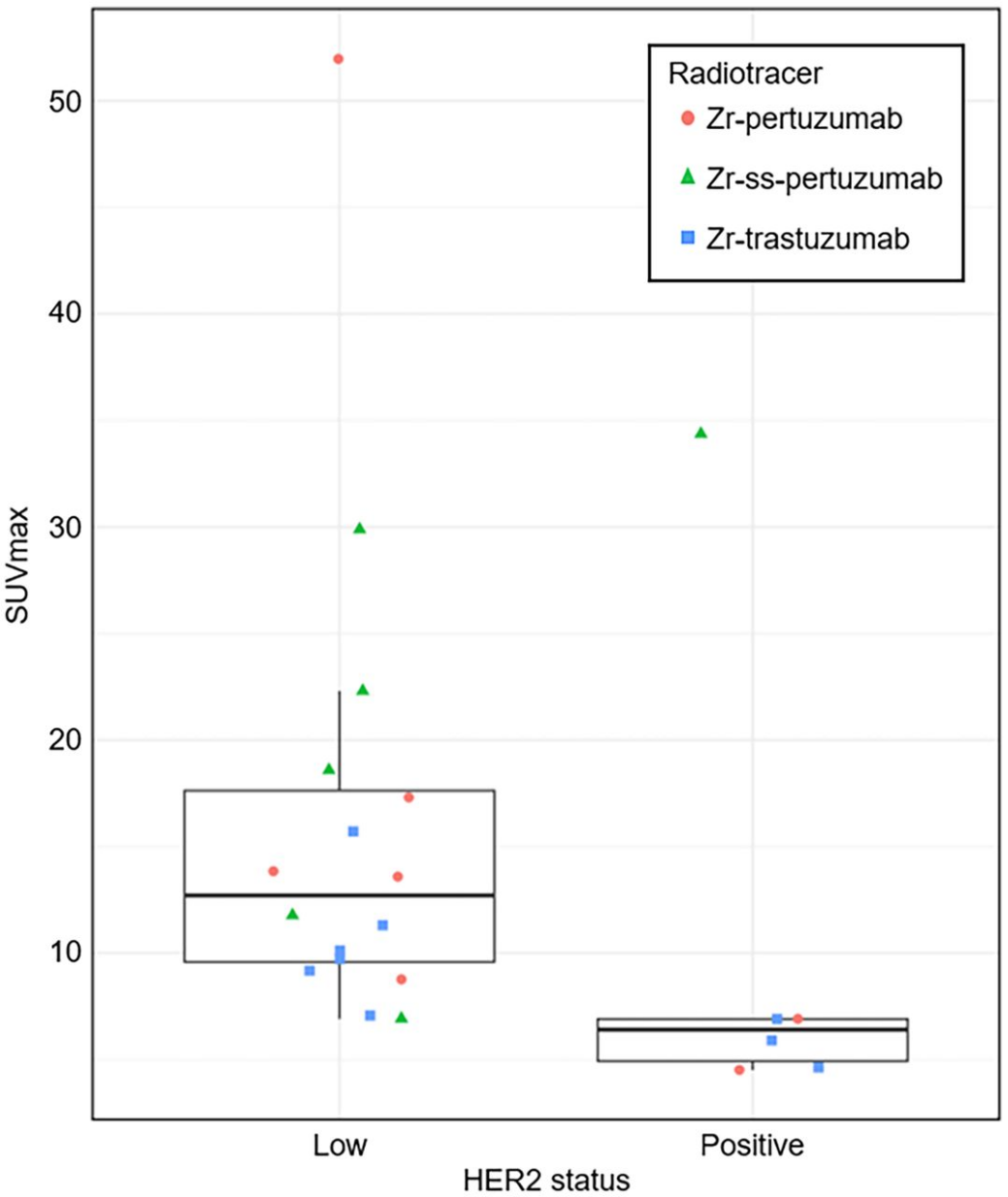 表2-4总结了每种放射性示踪剂的活检部位、HER2病理学和SUVmax。比较了所有3个放射性示踪剂队列组合中HER2阳性和HER2低表达病灶的SUVmax。与HER2阳性病灶(中位数 6.4;四分位距 1.98;P = 0.01)相比,HER2低表达病灶具有显著更高的SUVmax(中位数 12.7;四分位距 8.05)。表5总结了HER2阳性和HER2低表达病灶中每种放射性示踪剂及所有示踪剂组合的中位SUVmax。