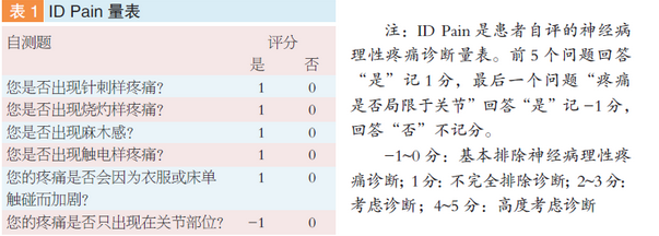 量表可用于神经病理性疼痛的筛选,如ID Pain量表(表1)、LANSS量表。体格检查和辅助检查的目的:一是证实存在躯体感觉系统的损害,二是获得病变或疾病的证据。