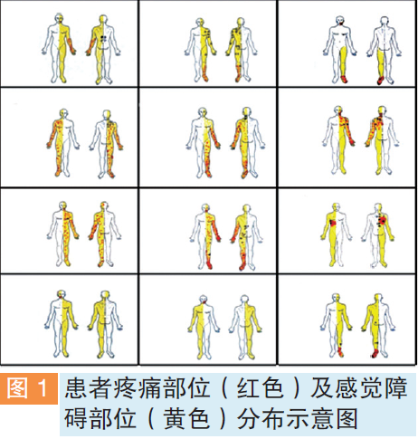 CPSP常逐渐起病,疼痛局限于卒中累及的躯干或肢体同侧感觉障碍区域。疼痛范围较大,常为半身或偏侧肢体,或仅为感觉障碍区的一部分,以远端如手部、足部多见(图1)。如果主要累及前胸部,可表现出与心肌缺血相似的症状,要注意鉴别。部分患者没有明显感觉障碍也可出现CPSP。