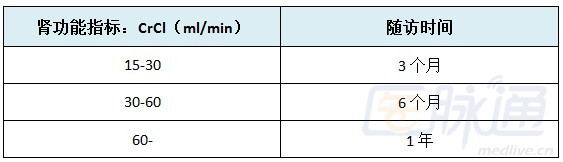 w几个月内肾功能恶化,应考虑以下的监测方案:(1)I-II期CKD(CrCl>60ml/min):1年;(2)III期CKD(30ml/min<CrCl<60ml/min):6个月;(3)IV期CKD(CrCl≤30ml/min):3个月