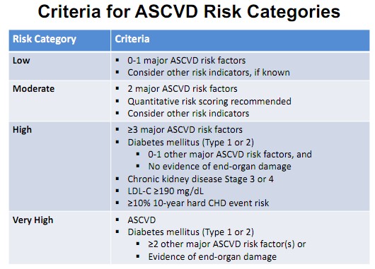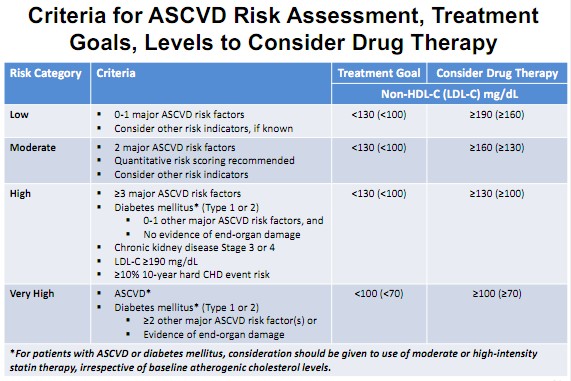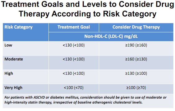 第二,NLA建议推荐了治疗目标,而ACC/AHA指南取消了具体的胆固醇目标。对于低-高风险者,NLA建议推荐将非HDL-C治疗目标设定为<130 mg/dL,极高风险者,推荐非HDL-C<100 mg/dL。
