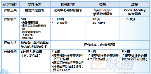 2014年《stroke》杂志发表了一项动脉粥样硬化多种族研究(MESA),主要针对亚临床和临床心血管疾病风险因素的纵向观察研究,涉及美国6个州的研究中心,从2000年随访至2012年。基线样本量为6814例无临床心血管疾病患者,年龄45-84岁。主要研究指标包括慢性压力、抑郁症状,愤怒和敌意(表),以观察这些心理的功能指标到底对卒中有哪些影响。这项研究的终点事件是卒中/TIA复合终点,次要终点为仅卒中事件。以Cox比例风险模型分析相关性的风险比值比(HRs):模型1,排除种族、性别、年龄、教育和临床研究中心因素;模型2,进一步排除收缩压