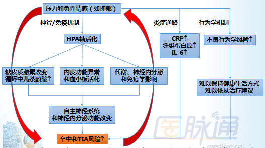 在这项研究中,研究者们进行了一个讨论,即抑郁/慢性压力/敌意与脑血管时间相关的可能机制。大概通过三个机制,第一个机制是压力和负性情感(如抑郁)可能会影响我们的神经/免疫机制,从而改变内皮功能异常和血小板的活化,以及代谢、神经内分泌和免疫学的影响等,改变自主神经系统和神经内分泌功能,最后造成卒中和TIA风险的增加。另外一个途径可能通过炎症通路,CRP和纤维蛋白原增高,然后影响卒中和TIA发作。第三个是行为学机制,会有不良行为学风险增加,难以保持健康生活方式以及依从性的下降,从而造成卒中和TIA的风险增加。