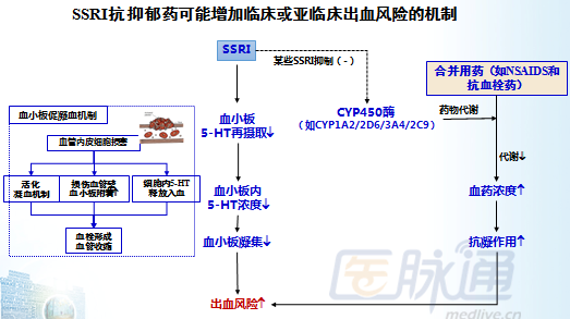这种的说法源自于这样的一个学说,即SSRI可能会影响血小板5-HT再摄取下降,造成血小板内5-HT浓度下降,凝聚力下降,最终导致出血风险增加。另外一个很重要的途径是某些SSRI可能会抑制CYP450酶,尤其在同时合并一些NSAIDS以及抗血栓药时,通过影响药物的代谢过程,代谢下降,血药浓度增加,那么抗凝作用增加,导致出血风险增加。