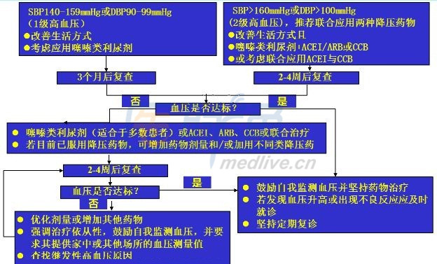 2013 AHA/ACC/CDS高血压控制有效途径科学建议与欧洲指南差异不大,整体血压控制目标为<140/90mmHg;对于非裔美国人、老年人、左心室肥厚、收缩期或舒张期左室功能不全、糖尿病或慢性肾病患者,更低的血压目标值可能更佳。相对来说,比欧洲指南更积极一点。建议中提出了降压治疗流程。