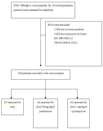 我们将2006年1月31日至2013年12月31日之间的连续145位代偿性乙肝肝硬化合并重度血小板减少的患者纳入了研究。我们将患者分为3个治疗组,包括NA单药治疗组(n = 57)、NA+强的松治疗组(n = 46)和NA+ CsA治疗组 (n = 42)。我们对每组的血小板计数、出血事件、肝功能、HBV复制和疗效进行了分析。