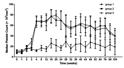 在观察期间的所有时间点,强的松组或CsA组血小板计数都高于NA单药治疗组。3组间出血事件的累积率存在显著差异。多变量分析显示,血小板计数和治疗方案是出血事件的相关因素。