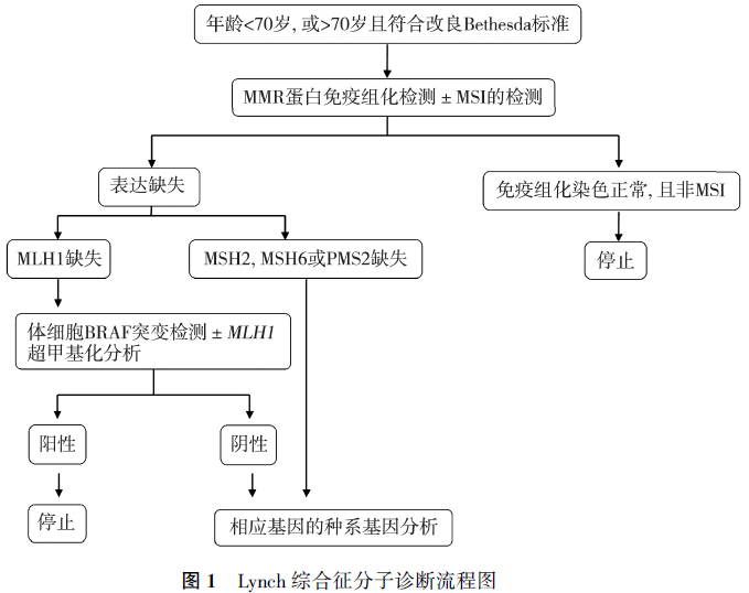 2.MMR缺陷LS结直肠癌的筛査:对任何70岁以前诊断为结直肠癌者和70岁以上并适合修订版Bethesda指南的那些人,应该进行基因筛査。LS患者通过MMR缺陷试验进行结直肠癌的筛査是划算的。已有的资料提示,MSI和IHC检测敏感性相当,但IHC检测在确定MMR蛋白表达缺失方面有优势,有助于针对最可能发生突变的MMR基因进行有目标的DNA测序。若免疫组化MLH1蛋白缺失,还需检测BRAF突变,后者可致MLH1启动子甲基化影响蛋白表达。LS的分子诊断流程图见图1。