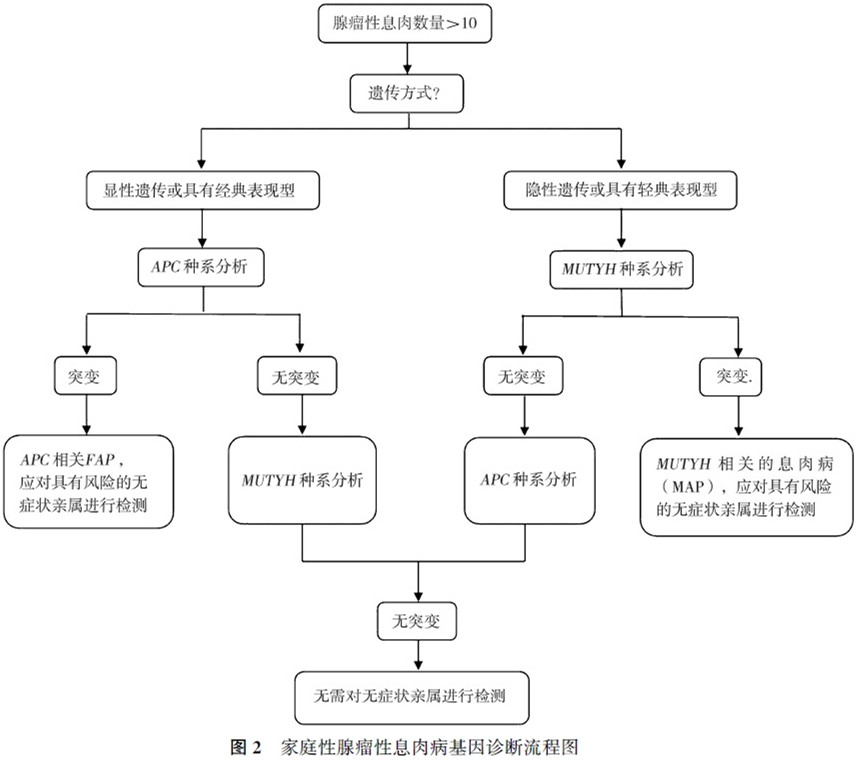 显性遗传模式,而MAP则表现为隐性遗传。为明确诊断,可行APC和(或)MUTYH的种系基因测序,并对家族中无症状的存在遗传风险的亲属进行种系的基因测序,及早发现并密切随访。FAP基因诊断流程图见图2。
