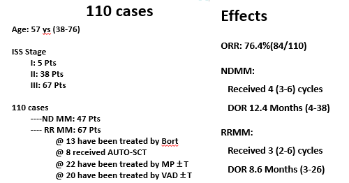治疗新诊断和复发/难治性的多发性骨髓瘤(MM)的报道与国内整体现状相似,患者的分期总体上比较晚,新诊断MM组平均接受4个疗程的治疗,缓解持续时间(DoR)生存期12.4个月,复发/难治性MM组平均接受3个疗程治疗,DoR 8.6个月。总有效率(ORR)76.4%。