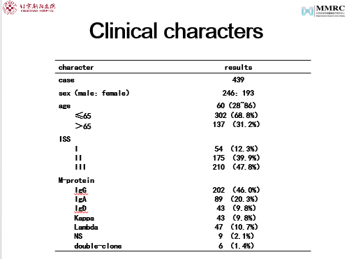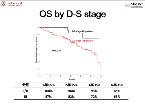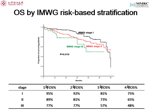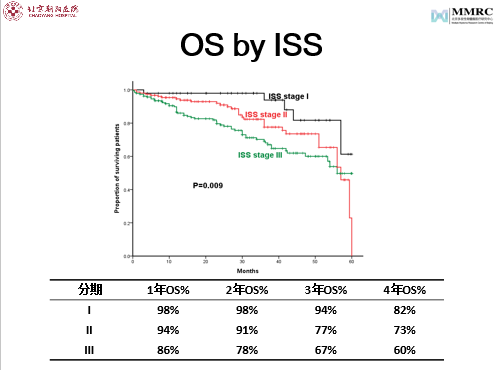 2010年-2014年北京朝阳医院单中心对439例MM患者进行了回顾性分析,结果与前面所介绍的研究并没有太大差异,患者中,约60%使用硼替佐米治疗,20%做了移植。患者平均总生存时间59个月,中位生存时间24个月。尽管有人认为DS分期过时了,在本研究中仍有一定意义的。DS分期I期、II期的患者疗效较好,III期相对差一些。ISS分期与OS结果具有相关性。IMWG危险分层区分效果不如国外报道的好。