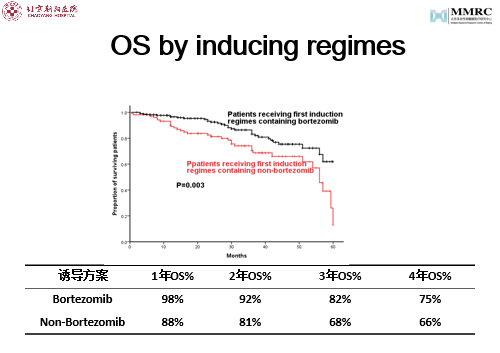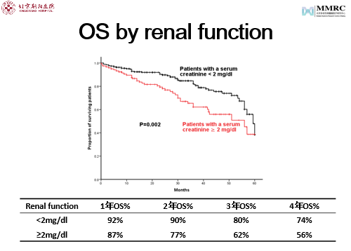 2015年发表在中华医学杂志上的一篇文章报道了上海长征医院、北大人民医院和北京朝阳医院三家医院的多中心临床研究。897例新诊断MM患者中,肾功能不全者占19.5%,使用含万珂的治疗方案后,肾功能不全患者与肾功能正常的患者PFS和OS几乎没有差异。新药时代,肾功能不全的患者还是需要用硼替佐米治疗,能够进一步改善肾功能不全带来的不良预后。