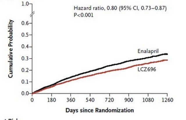 LCZ696 是一种血管紧张素受体脑啡肽酶抑制剂(ARNI),与以往药物不同的是,它具有双靶点抑制作用。PARADIGM-HF研究旨在探讨这种慢性心衰治疗新药 物能否替代传统的血管紧张素转换酶抑制剂(ACEI)或血管紧张素受体拮抗剂(ARB)。PARADIGM-HF研究最终纳入8399例患者,中位随访 27个月。结果显示,与依那普利20 mg/d相比,LCZ696 组有914例(21.8%)患者出现心血管死亡或心衰住院,依那普利组有1117例(26.5%)出现心血管死亡或心衰住院 (HR=0.8,95%CI:0.73 to 0.87; P<0.001),其减少1例主要终点需治疗的患者数为21例. 两组患者死亡率分别为711例(17.0%)和835例(19.8%)(HR=0.84; 95% CI, 0.76 to 0.93; P<0.001).另外,LCZ696 能降低心血管死亡20%风险,减少因心衰住院风险21% (P<0.001),还能减少心衰症状和活动限制 (P=0.001)。安全性方面,LCZ696耐受性较好,与依那普利相比较少引起咳嗽、高血钾、肾损伤或因不良反应停药,不增加严重血管性水肿风险,但低血压风险增加。
